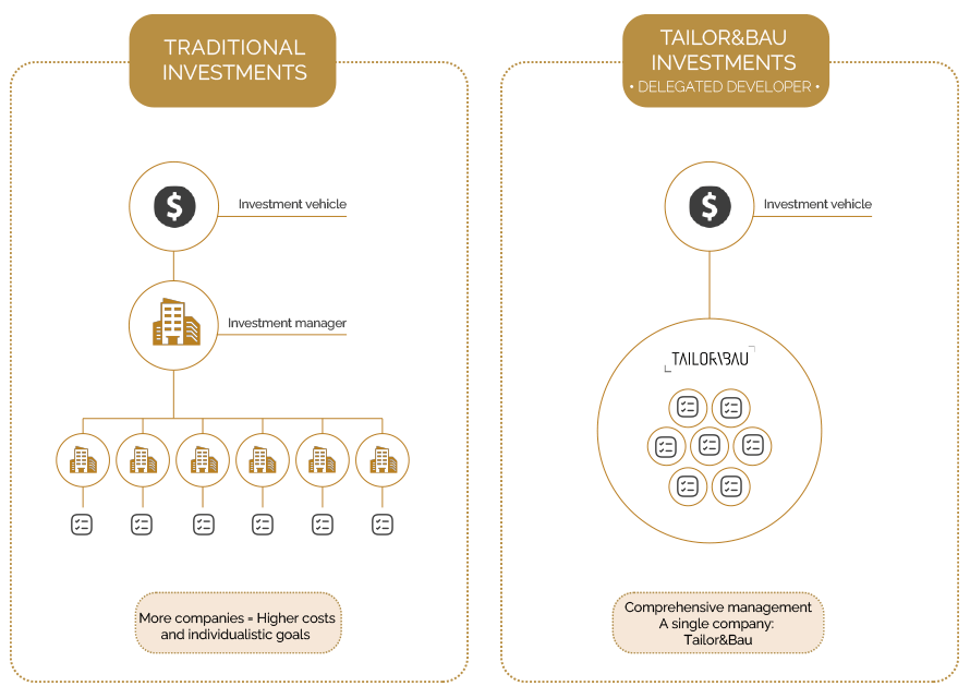 Unlike traditional investment vehicles, which subcontract multiple companies for each phase of the project, at TAILOR&BAU we integrate, carry out and supervise all processes from the beginning to the delivery of the project to the end user. This allows us to optimize each phase, avoid cost overruns and guarantee a management and execution aligned with the investment objectives.