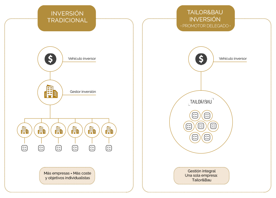 A diferencia de los vehículos d’inversión tradicionales, que subcontratan múltiples empresas para cada fase del proyecto, en TAILOR&BAU integramos, realizamos y supervisamos todos procesos desde el inicio hasta la entrega del proyecto al usuario final. Esto nos permite optimizar cada fase, evitar sobrecostes y garantizar una gestión y ejecución alineada con los objetivos de inversión.